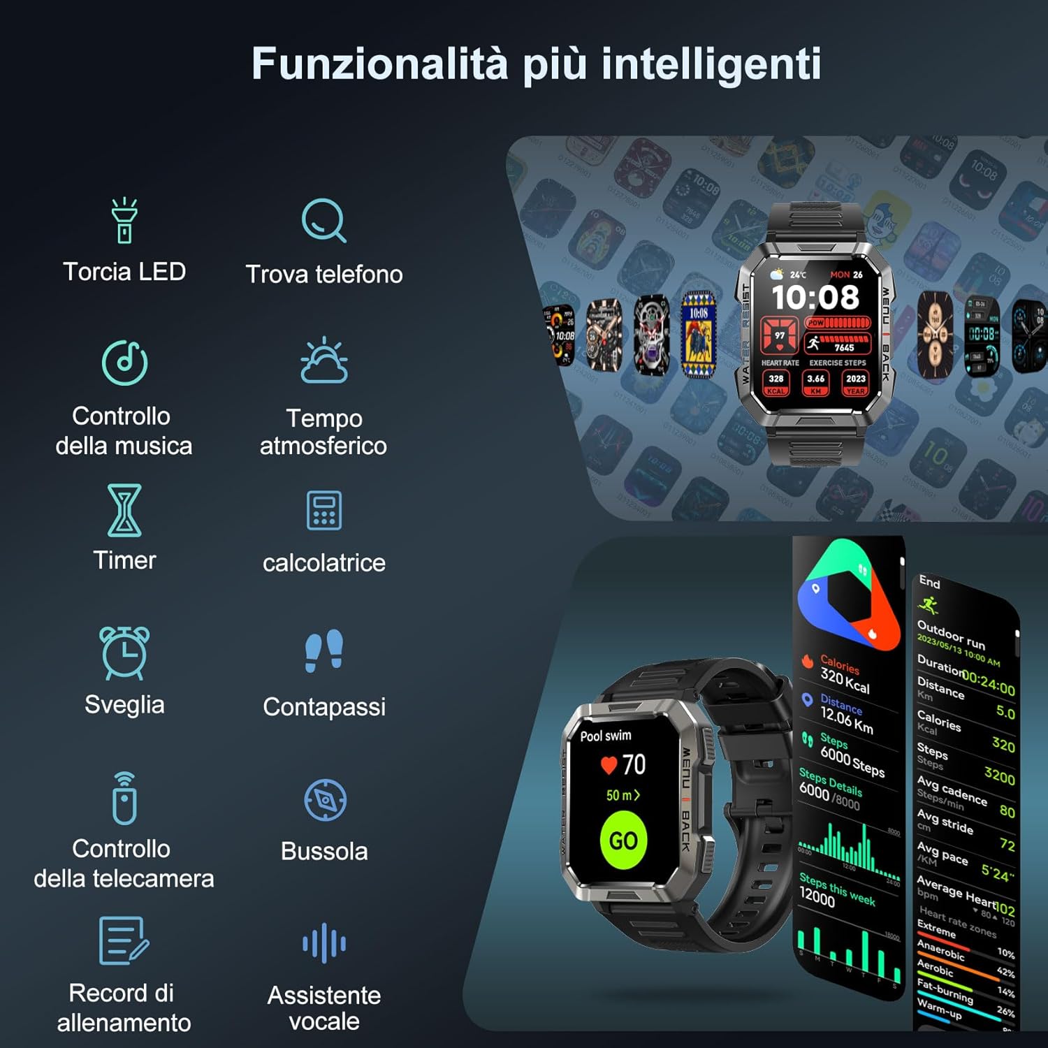 【Multifunzionale】Gli orologi da uomo sono dotati di funzioni pratiche e interessanti come torcia a LED, trova telefono, controllo della musica, meteo, timer, calcolatrice, sveglia, contapassi, controllo della fotocamera, bussola, registri di allenamento, assistente vocale, allenamento della respirazione, alzando la mano per illuminare lo schermo, ecc. L’orologio ha una funzione di regolazione della luminosità a 5 livelli e lo schermo è chiaramente visibile alla luce del sole.
