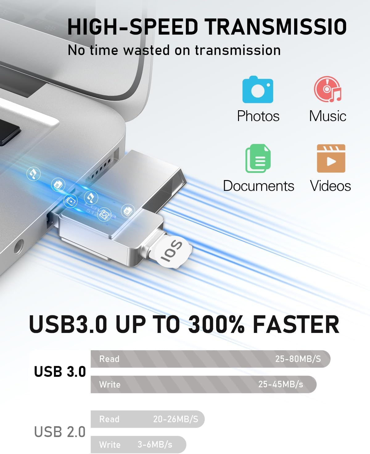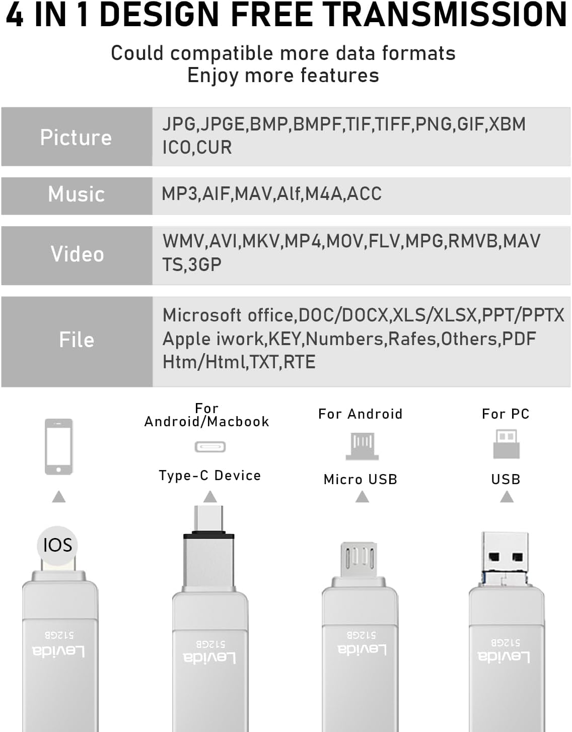 ✅【Compatibilità estesa 4-in-1】- La chiavetta USB Levida supporta porte iOS + Type C + USB 3.0 e altri dispositivi, ed è compatibile con la maggior parte dei formati di file: musica MP3/WAV/AAC/AIFF/AIF/M4A/WMA, immagini PNG/JPG/GIF/JPEG/RAW/ICO/TIFF, documenti XLS/XLSX/DOC/PPT/PDF/HTML/TXT.