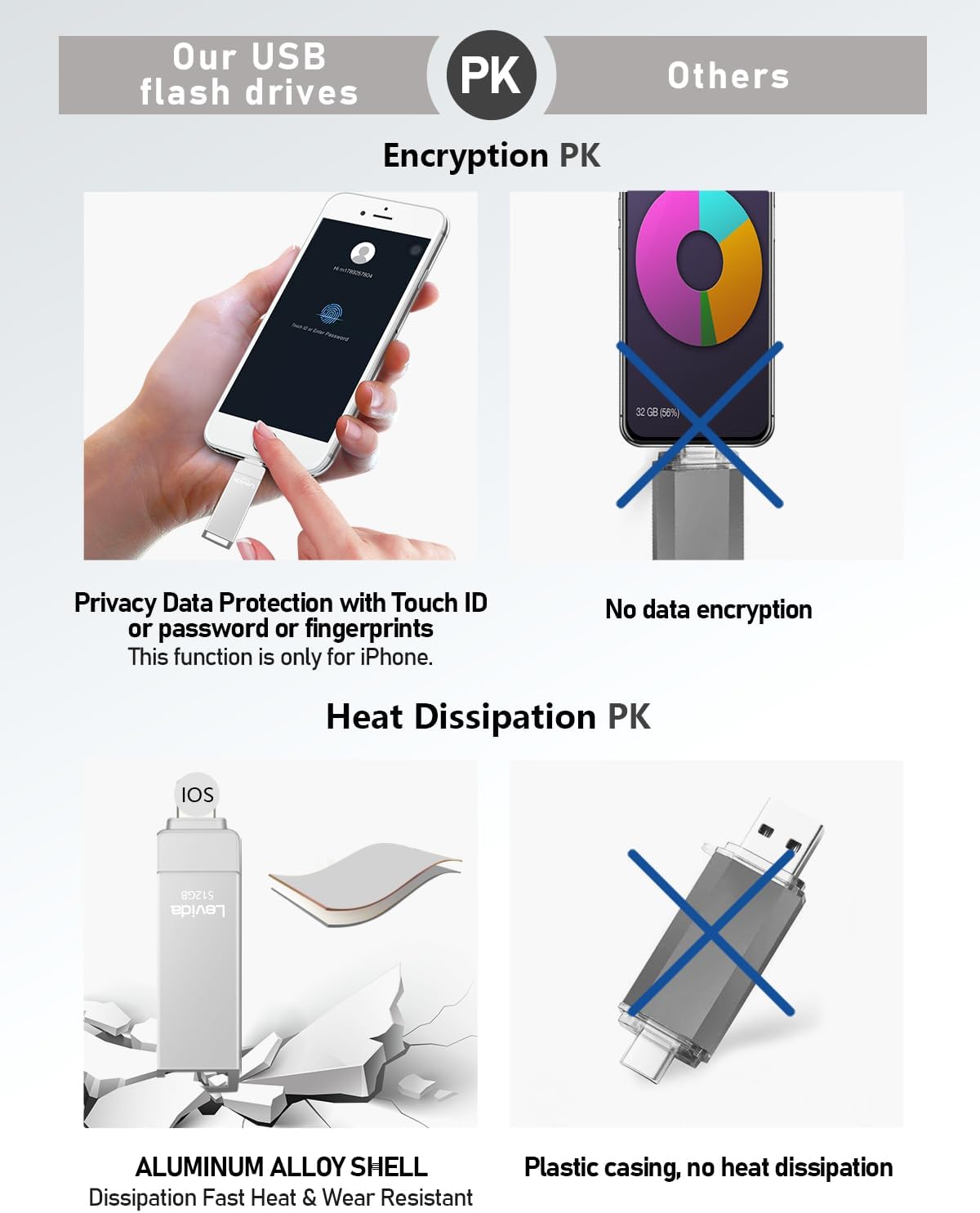 ✅【Memorizzazione più sicura con protezione password】- La chiavetta USB Levida offre una funzione di protezione password sicura che consente di crittografare le informazioni dei file sullo storage esterno del telefono. Con Touch ID e password, puoi proteggere documenti sensibili sulla chiavetta USB da 512 GB, riducendo al massimo il rischio di operazioni non autorizzate.