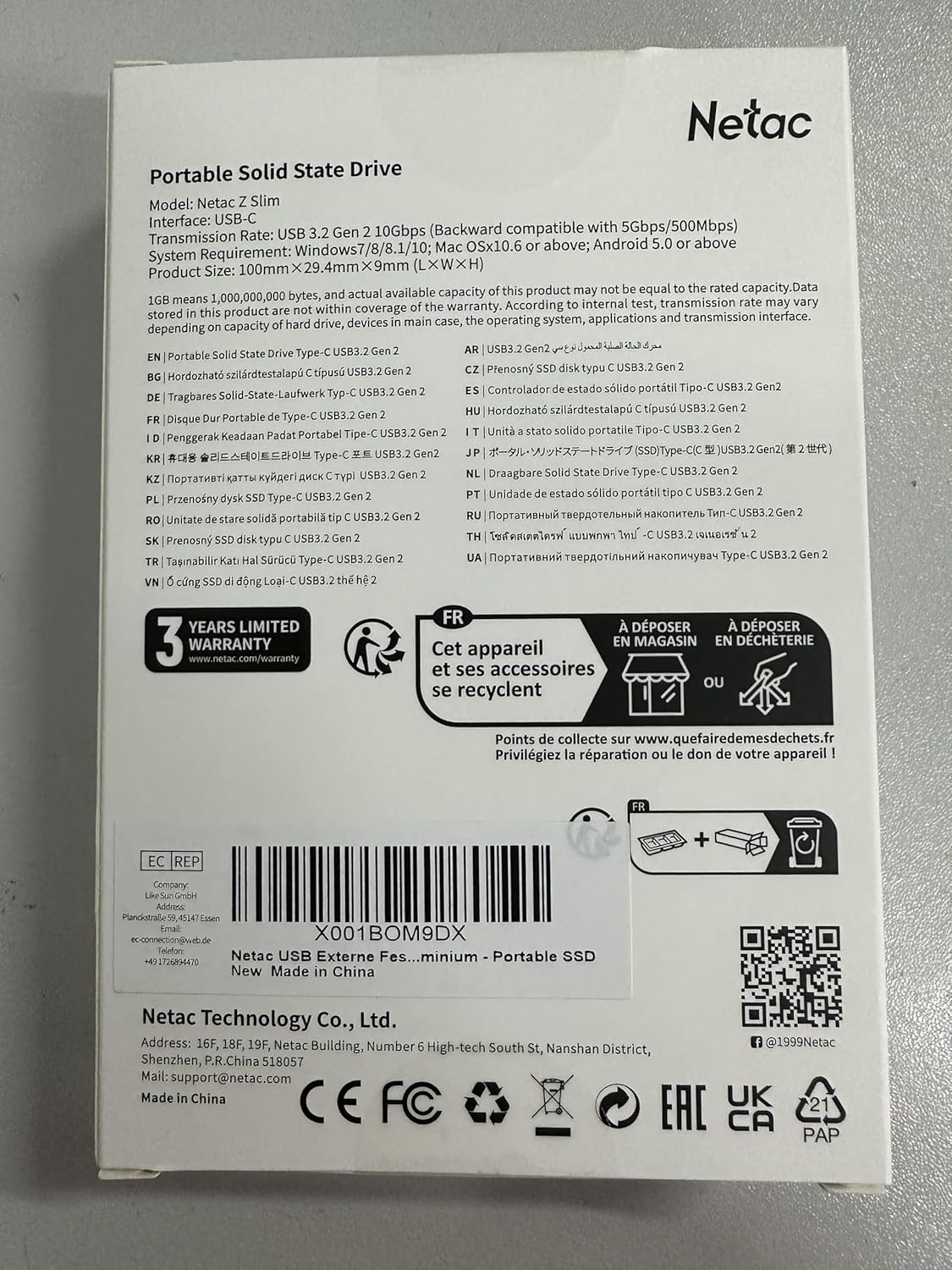 L’unità SSD portatile misura solo 100 x 29,4 x 9 mm (L x W x H) e pesa solo 30 grammi. Dotato di connettore USB 3.2 Gen 2 da Tipo-C ad A e adattatore da Tipo-A a C, custodia in pelle e manuale.