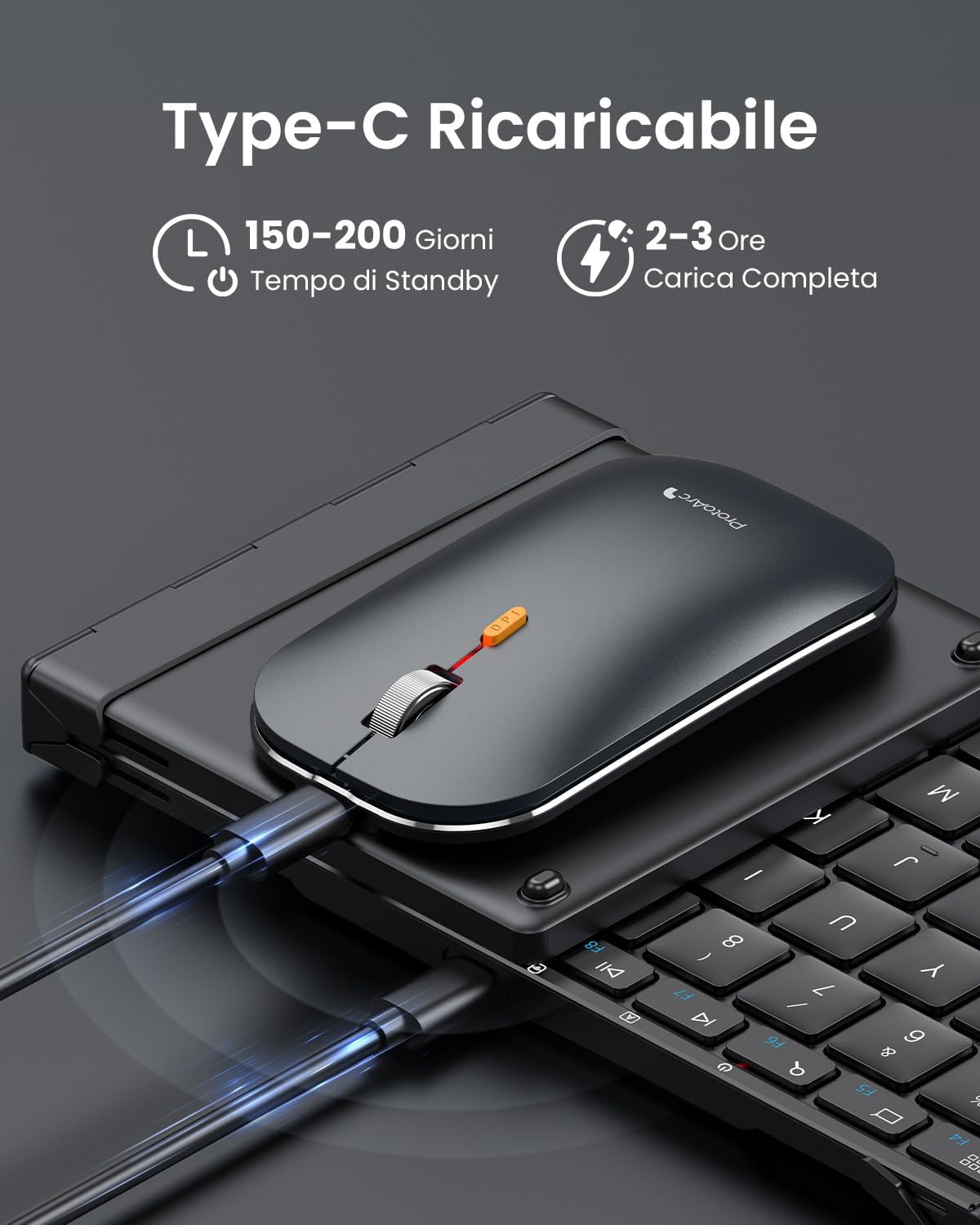 La tastiera mouse pieghevole XKM01 è compatibile con i computer Windows, Mac, Chrome, iOS o Android. Il Bluetooth 4.0 e il wireless 2.4G consentono una connessione veloce e stabile. È possibile sincronizzare fino a tre dispositivi. La sincronizzazione avviene automaticamente all’apertura della tastiera.