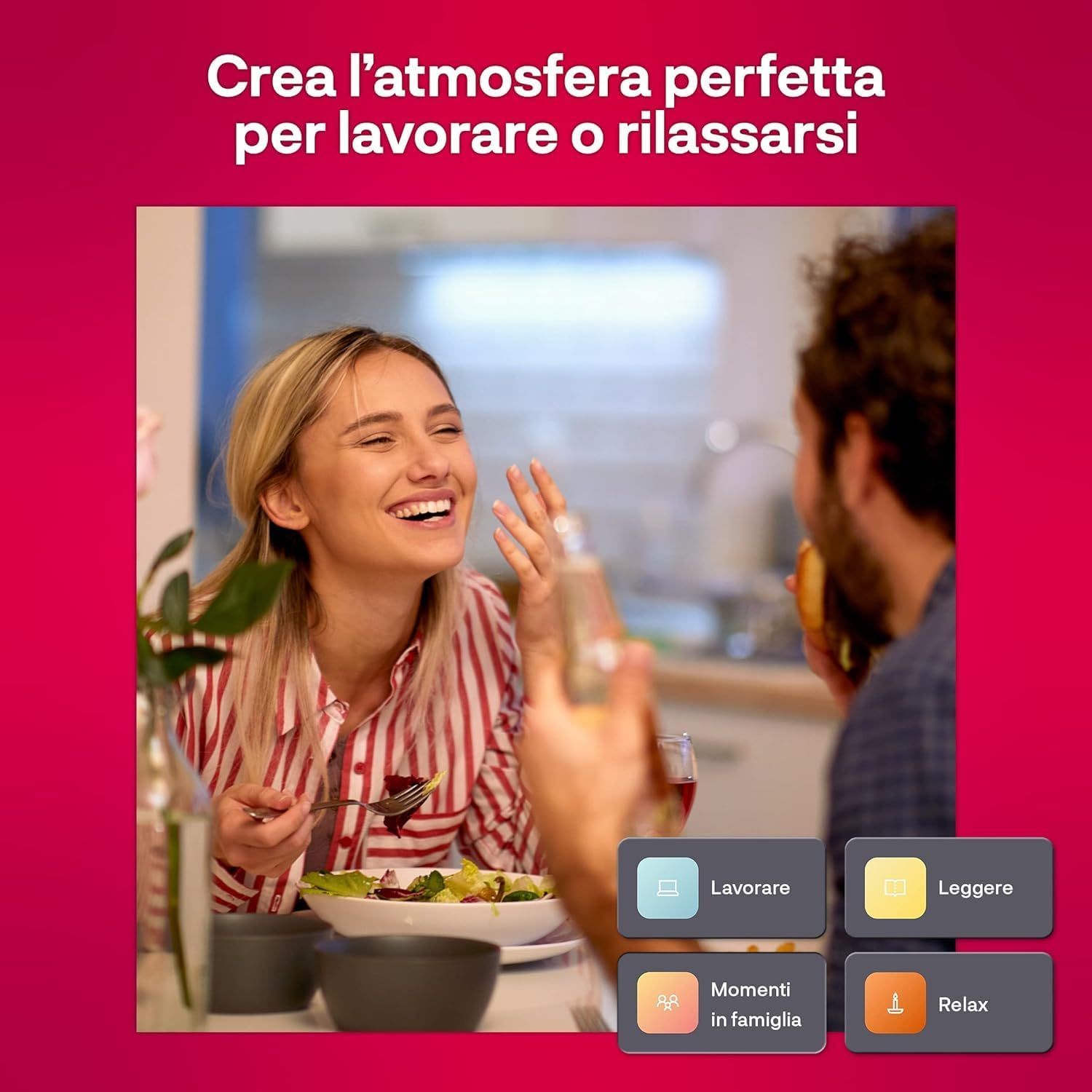La funzione bianca regolabile consente una luce bianca brillante quando si lavora e un’illuminazione d’atmosfera morbida e calda per una cena accogliente. Il bianco regolabile significa che è possibile scegliere sia la luminosità della lampadina sia le tonalità bianche: 2200K corrisponde al bianco caldo, dove si passa attraverso il bianco freddo a 5000K, il che corrisponde alla luce diurna.