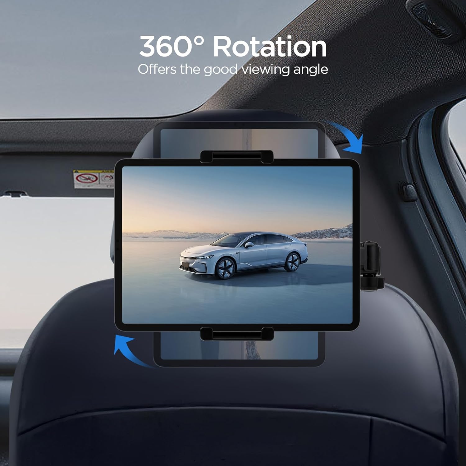 ROTAZIONE E REGOLAZIONE A 360°: Il carrello supporto tablet auto è dotato di un giunto sferico girevole a 360° che gli consente di ruotare di 360° per tenere il tablet in verticale o in orizzontale. È possibile regolare l’angolo in base alla propria vista per ottenere un’altezza di visione e una chiarezza ottimali, in modo da poter guardare film, leggere, giocare e ascoltare musica comodamente mentre si viaggia