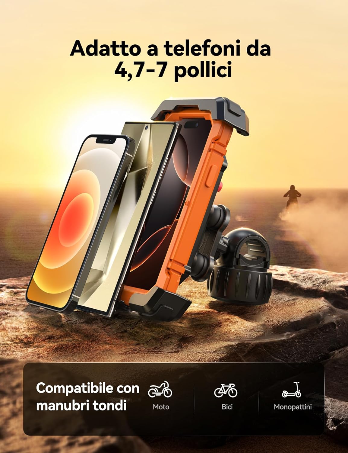 🚲【𝟰,𝟳”-𝟳” | 𝟭𝟴-𝟯𝟰𝗺𝗺】Questo Porta Cellulare Moto è compatibile con smartphone 4,7″-7″ (incl. iPhone 16/15/14/13 Pro Max & Samsung S24/23 Ultra. Eccezione: dispositivi da 6,8 pollici con cover extra spessa o S24 Ultra/ iPhone Pro Max serie con cover). Compatibile con manubri 18-34mm (0.7-1.34″) – bici, moto o e-bike: monta, serra e parti!【⚠️NOTA IMPORTANTE: Non adatto a manubri inferiori a 0,7 pollici (18 mm)!】