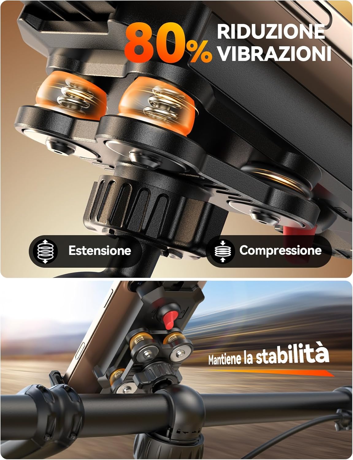 🚲【𝗗𝗼𝗽𝗽𝗶𝗮 𝗥𝗶𝗱𝘂𝘇𝗶𝗼𝗻𝗲 𝗩𝗶𝗯𝗿𝗮𝘇𝗶𝗼𝗻𝗶 𝗲 𝗔𝗻𝘁𝗶-𝗦𝗰𝗼𝘀𝘀𝗮】Il Porta Cellulare Bici JOYROOM 2025 combina ammortizzatori a 4 punti con airbag e cuscinetti in silicone spessi – questo doppio sistema riduce l’80% delle vibrazioni stradali (5x più efficace dei supporti standard). Protegge il modulo della fotocamera dall’usura da vibrazioni e mantiene il telefono stabile anche a 80 km/h su terreni sconnessi