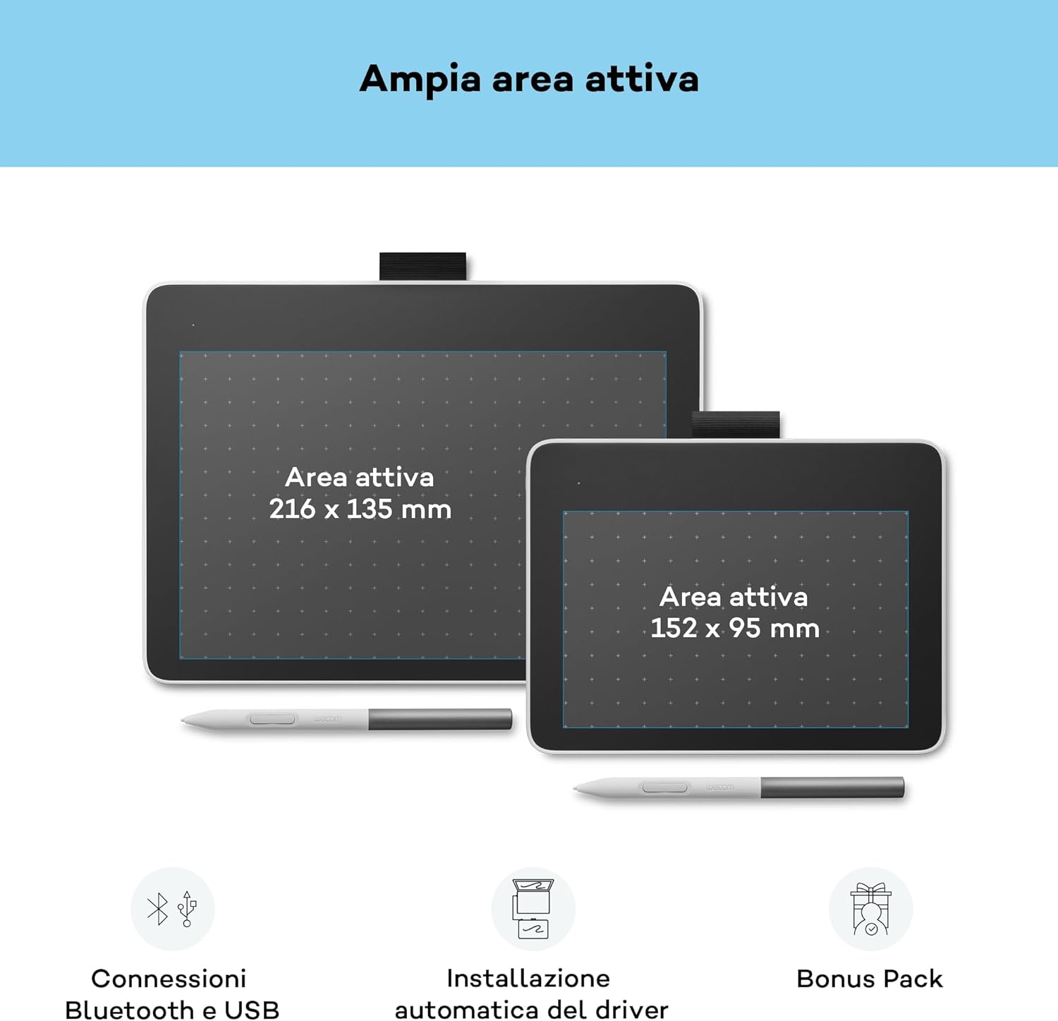 Le tavolette Wacom One sono progettate per i creativi principianti e offrono una transizione intuitiva nel mondo dell’arte digitale. Prova l’autentica sensazione, sembra di usare carta e penna, per disegnare in modo naturale e liberare la tua creatività senza sforzo. Il loro design sottile e compatto garantisce una facile trasportabilità, consentendoti di creare ovunque ti colga l’ispirazione. Con 4.000 livelli di sensibilità alla pressione, queste tavolette offrono una precisione senza pari, replicando ogni tratto e sfumatura della tua espressione artistica.