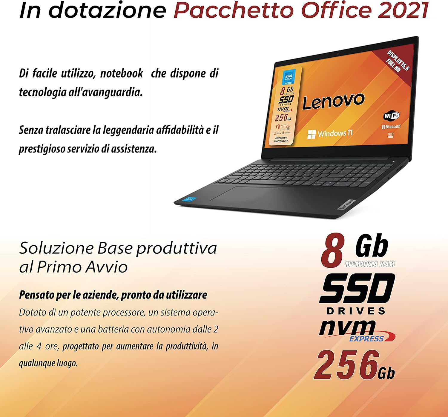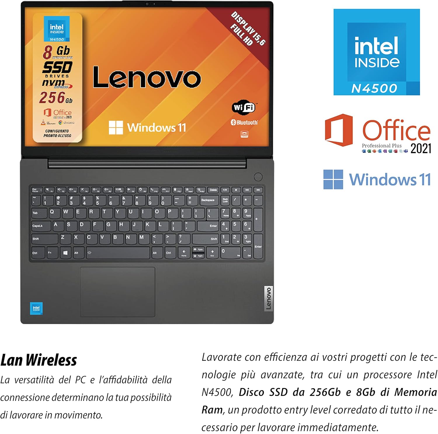 Lenovo – Notebook 15.6 Pollici V15 G2 IJL, Pc Portatile Windows 11 Home, Intel N4500, Ram 8GB DDR4, 256GB SSD NVMe – Laptop Grafica Intel UHD, Computer Audio Dolby, Schermo FHD