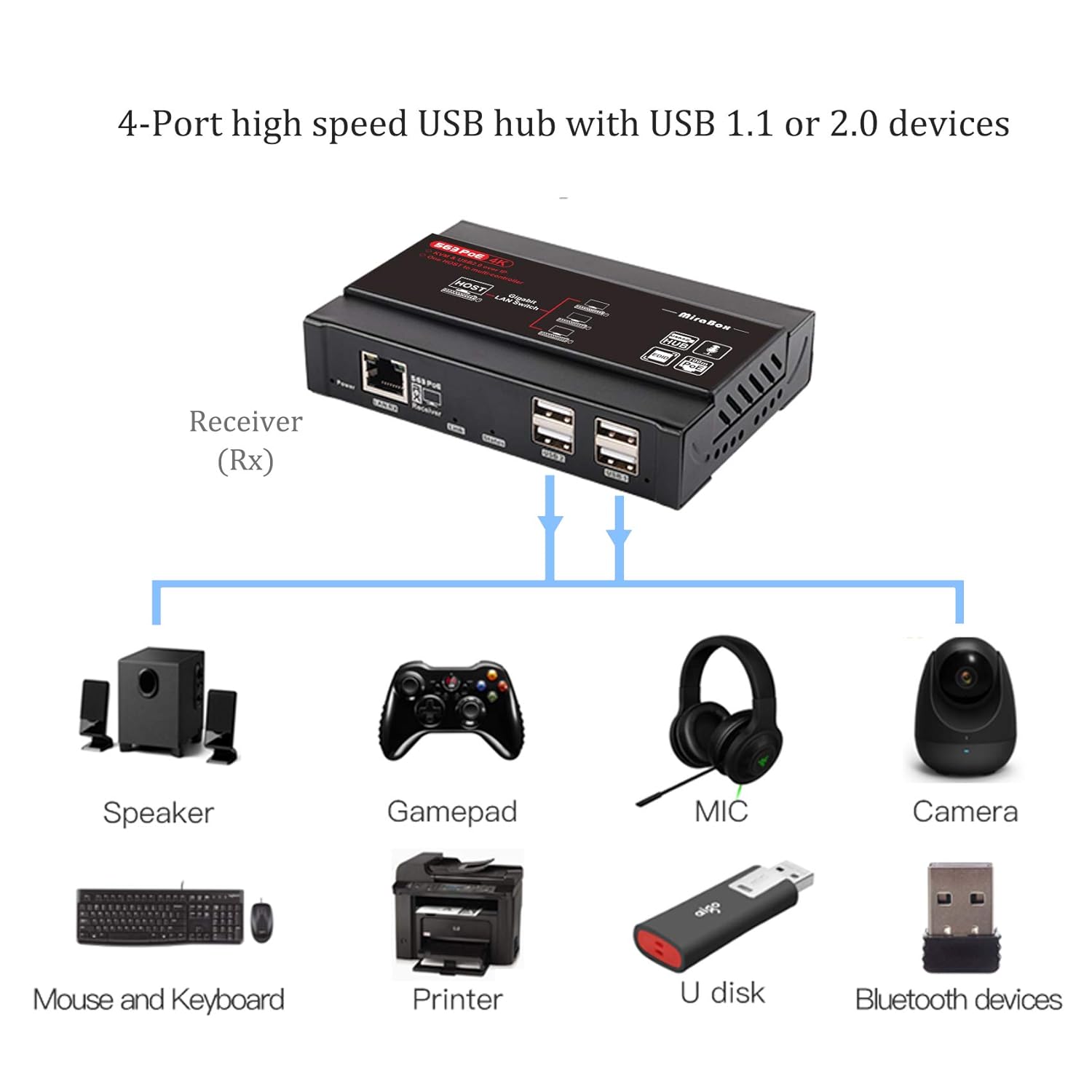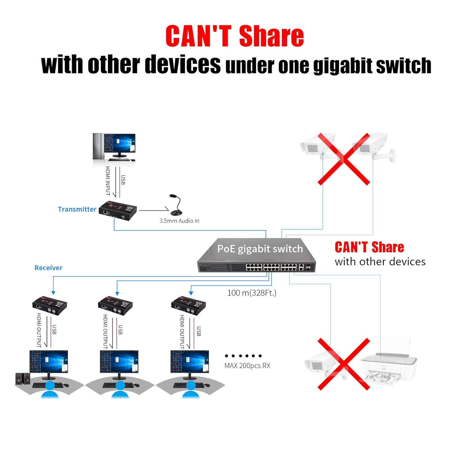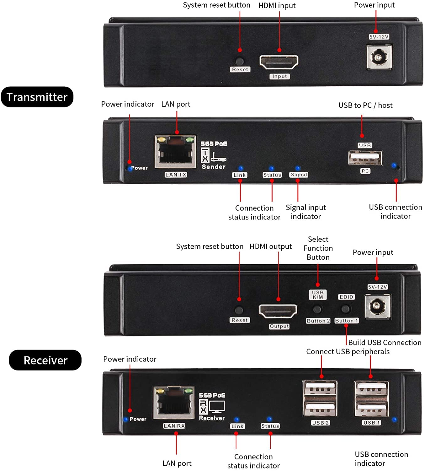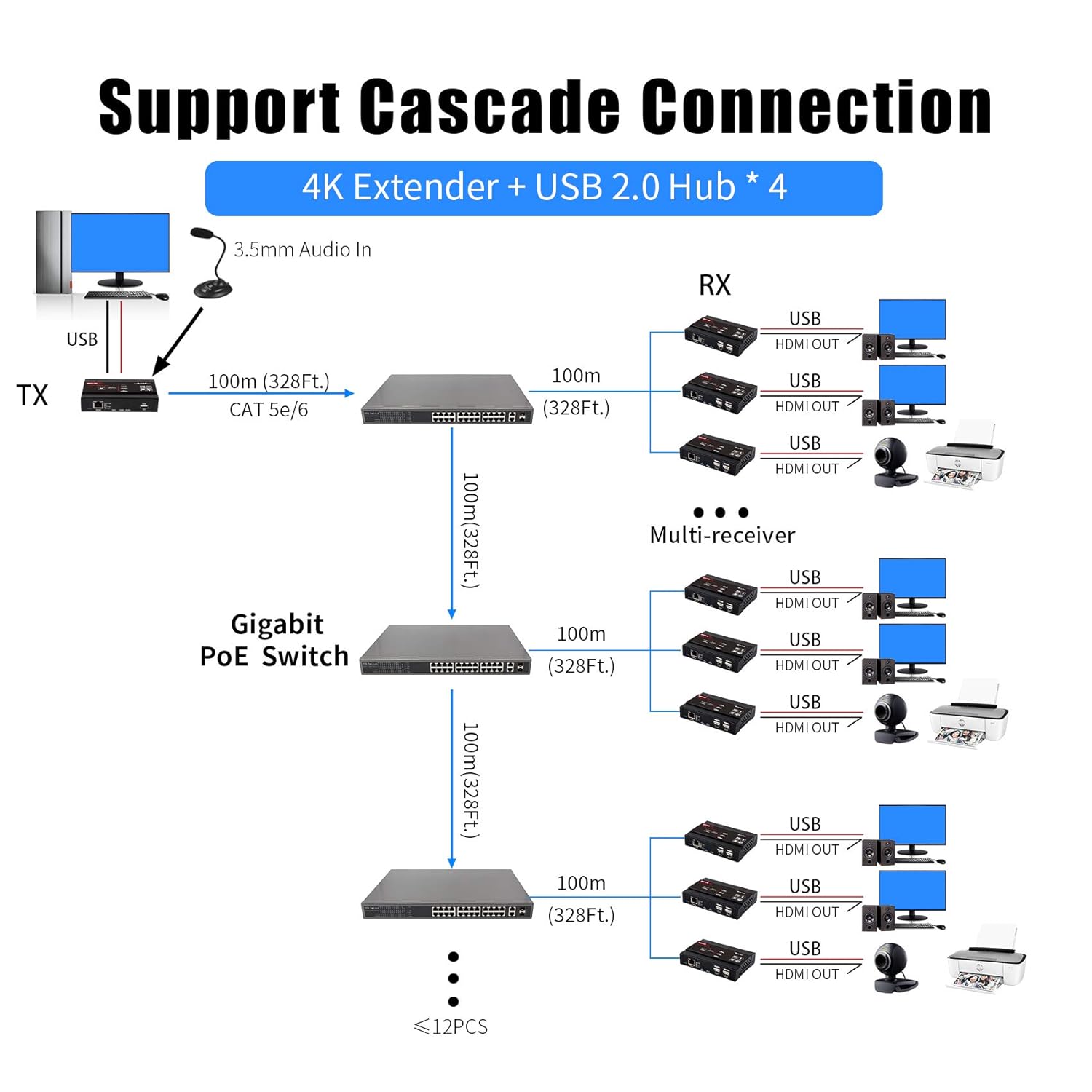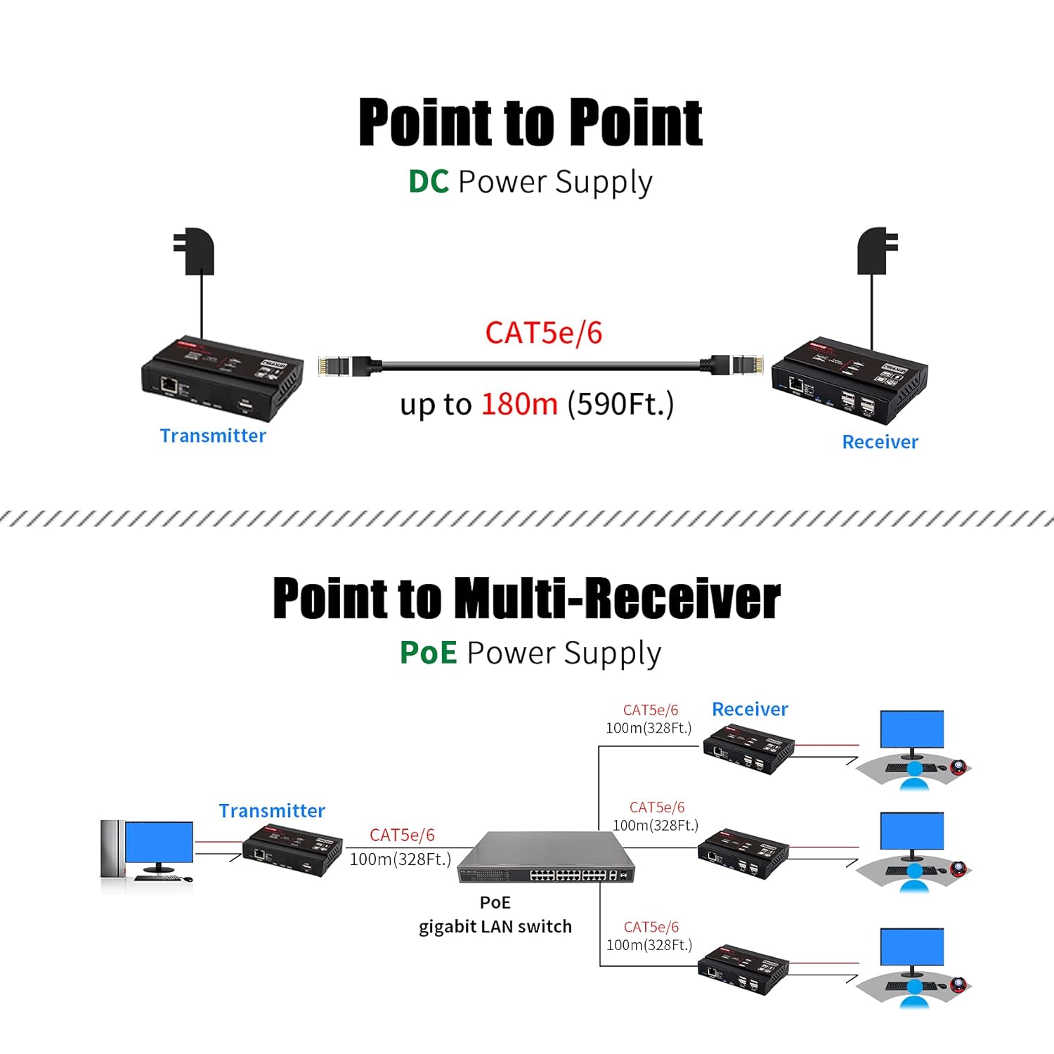 【Multicast / Unicast】 Supporto one-to-one (Unicast) fino a 120M su Cat5 / Cat5e / Cat6, uno-a-molti (Multicast , max 253 Ricevitore) per la trasmissione AV in tempo reale. Supporto USB per controllo PC KVM, è possibile collegare tastiera, mouse, touch screen, archiviazione nel sito del ricevitore per controllare il PC nel sito del trasmettitore, inoltre è possibile controllare il ricevitore con l’ingresso USB sul trasmettitore.