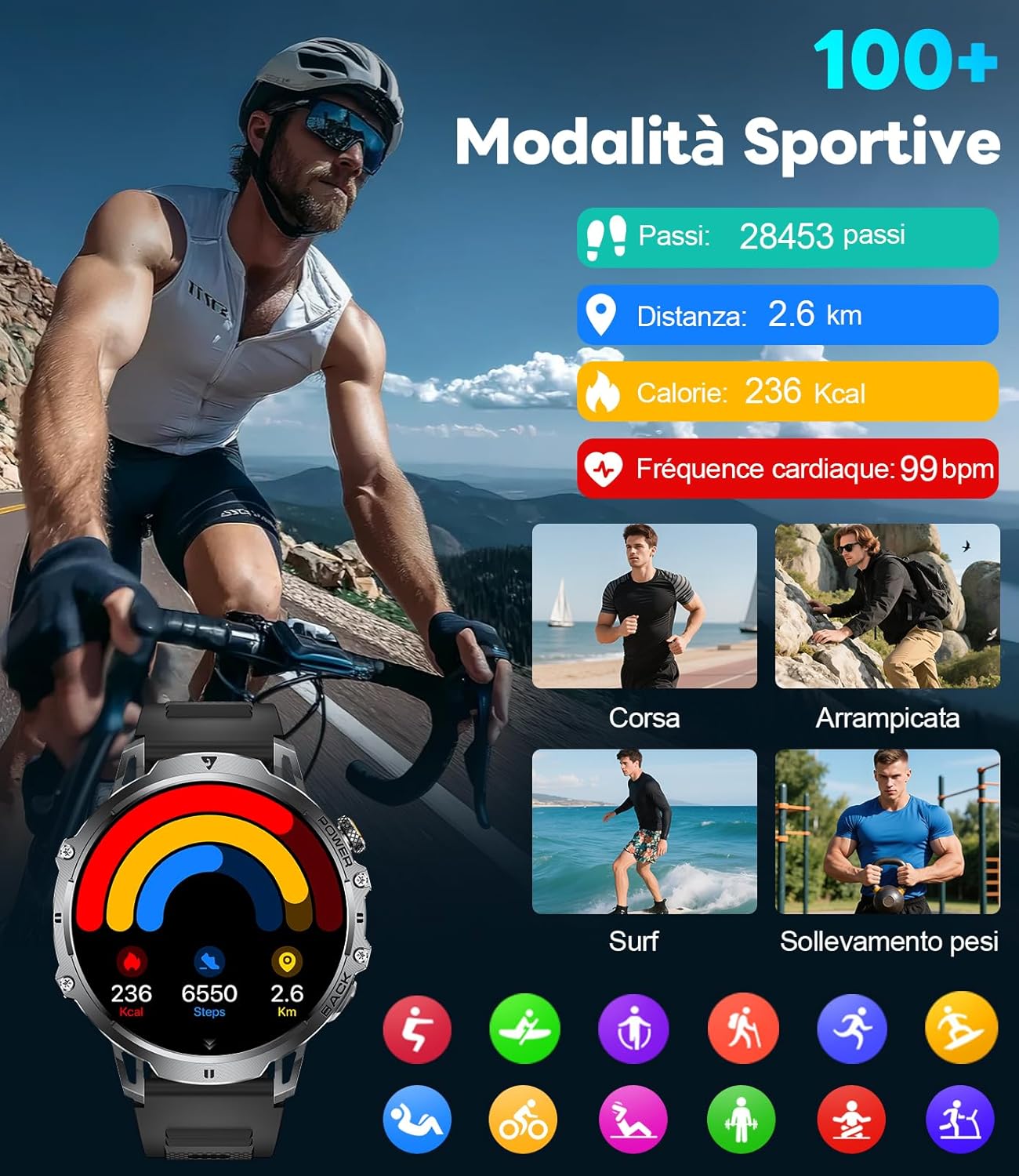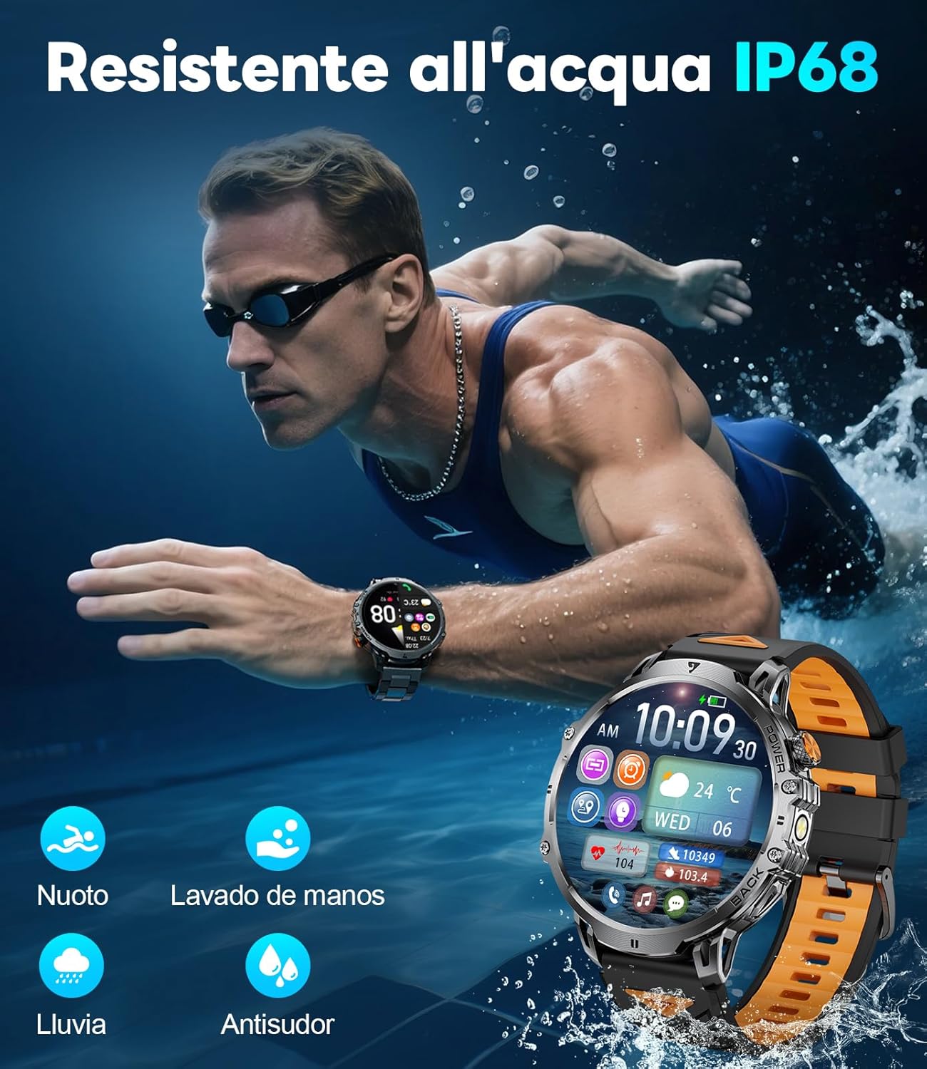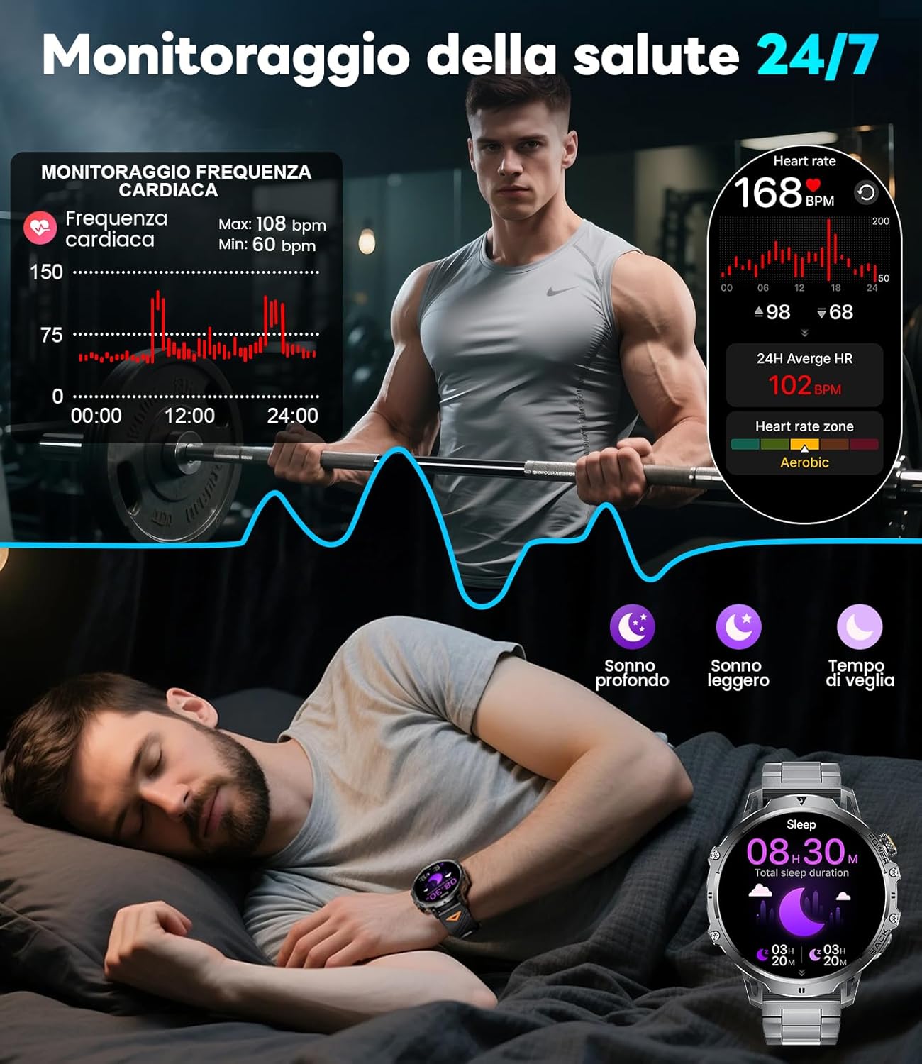 【1,85” IPS HD Grande Display grande,quadrante olografico e torcia a LED】 Lo smartwatch da uomo lige 2025 è dotato di un ampio schermo HD da 1,85” con un display dettagliato e chiaro e una luminosità regolabile per una visione chiara anche alla luce del sole. La frequenza di aggiornamento di 60Hz consente un funzionamento fluido. Dispone inoltre di più di 150 quadranti dinamici, tra cui meteo, contapassi e altre visualizzazioni di dati estese. La torcia LED da 800 lumen sul lato può essere utilizzata per oltre 2 ore in caso di emergenza. Se vi piacciono gli schermi grandi, questo nuovo smartwatch fa per voi!