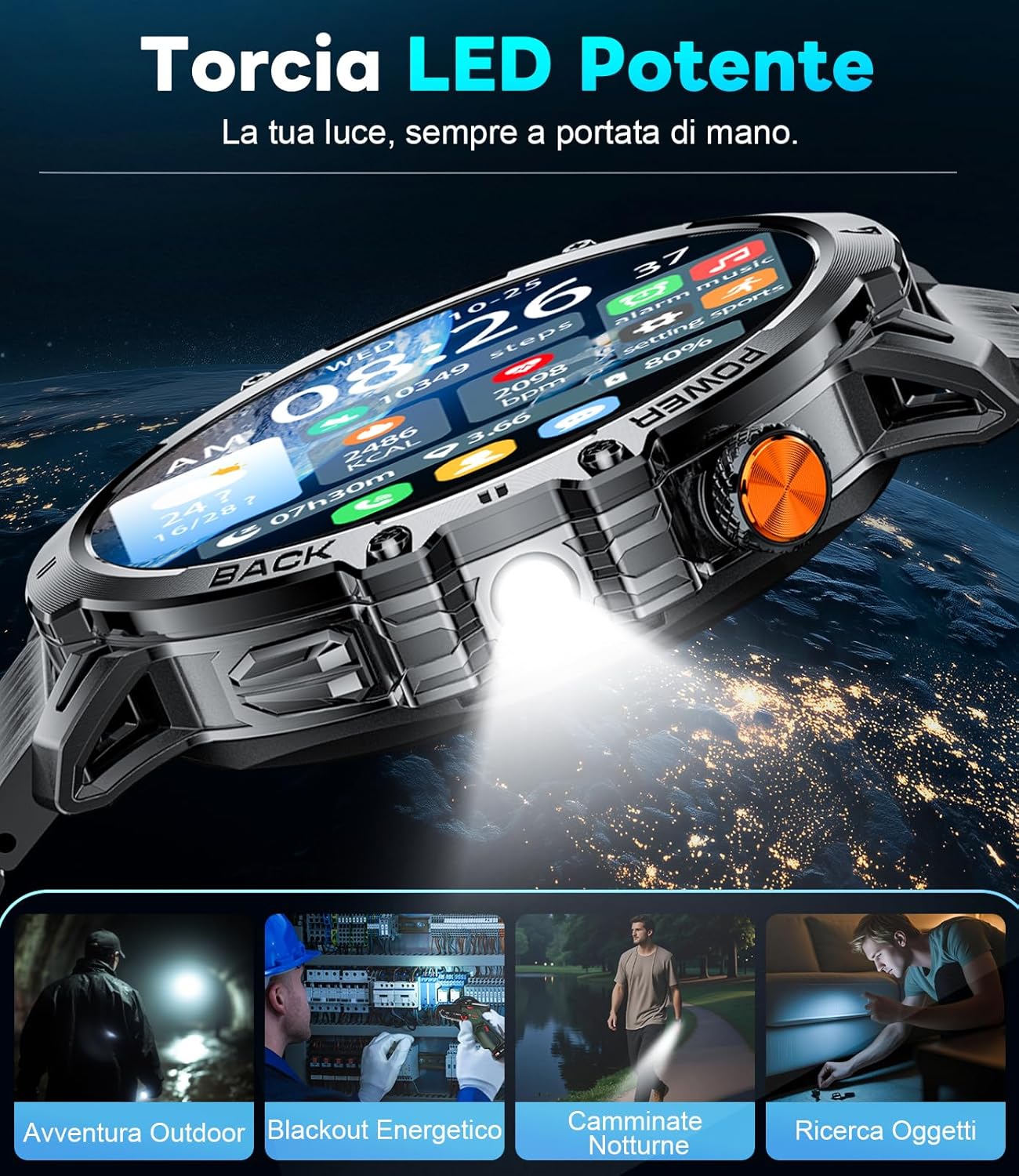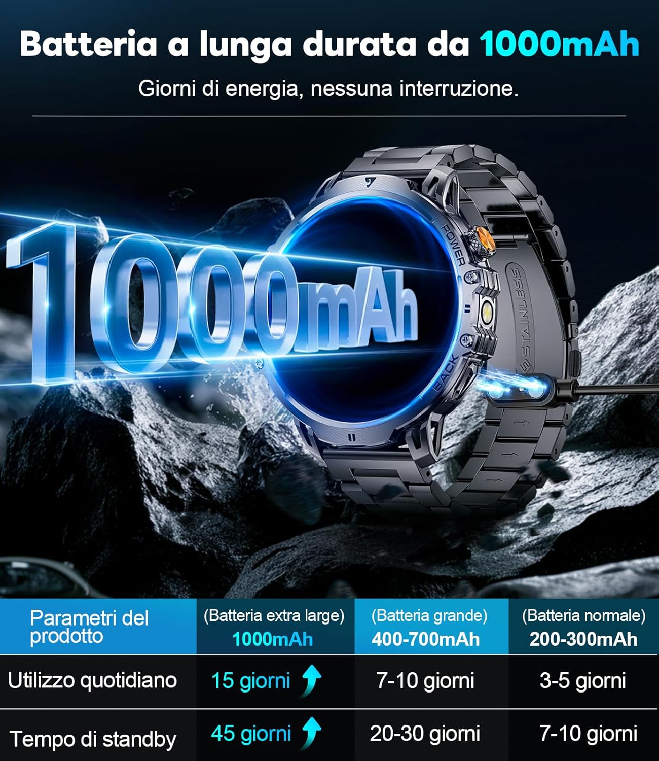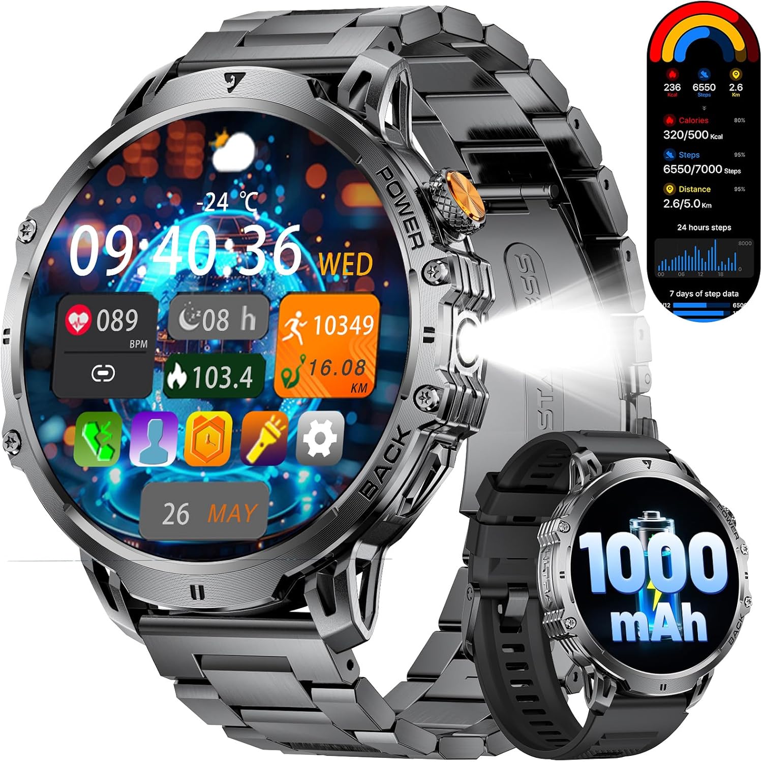 Smartwatch militare sottile LIGE 2025, schermo HD da 1,85”, batteria da 1000mAh, torcia, peso 55g