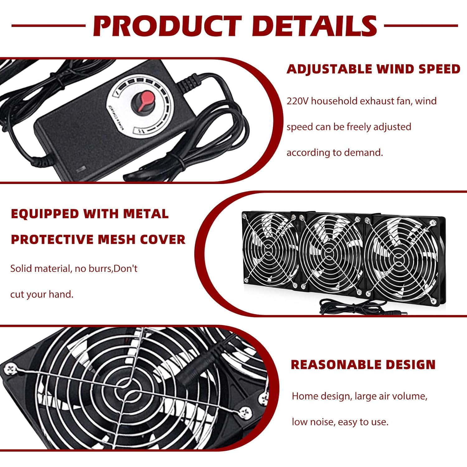 WIYETY – 3 ventole da 120 mm con controllo della velocità, 220 V, senza spazzole con copertura in metallo, grande volume d’aria, silenziosa, per computer, alloggiamento