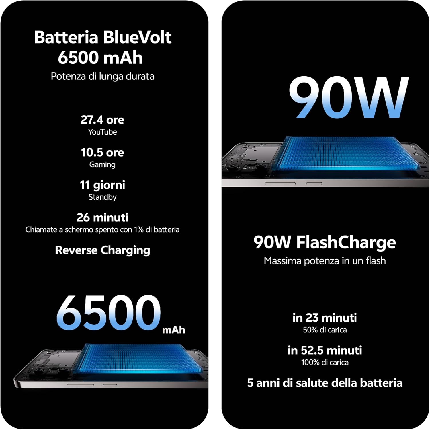 【 Batteria BlueVolt Ultra-Slim da 6500 mAh + Ricarica Rapida 90W 】 La batteria BlueVolt da 6500 mAh del V50 Lite garantisce prestazioni durature in un design sottile e compatto. La ricarica rapida da 90W offre un avvio super veloce da zero a 100% di carica in soli 57,5 minuti. Il sistema di protezione con chip di sicurezza protegge tensione, corrente e temperatura per una ricarica sempre sicura.